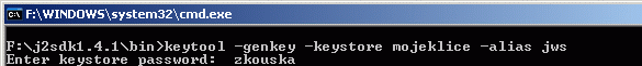 keytool -genkey -keystore mojeklice -alias jwsBudete vyzváni, abyste zadali heslo (pro přístup k vámi vytvořeným klíčům), dále křestní jméno a příjmení a nějaké další informace. Všechny údaje jsou nepovinné, ale měli byste uvést alespoň příjmení. Nedoporučuje se při podepisování používat akcentované znaky, protože JWS (verze 1.2) je zobrazit neumí.