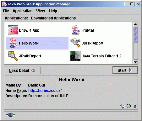 hello.jnlp spouštět -- opravdu spouštět, Java Web Start má totiž tyto soubory asociovány. Spouštění může být dokonce odkudkoliv (tj. soubor hello.jnlp může ležet v libovolném adresáři), ale pak je nutné mít současně jednu kopii hello.jnlp ve stejném adresáři jako Hello.jar.