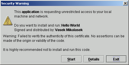 Vzápětí se pokusí JWS program spustit. Nicméně, protože program (poněkud uměle) vyžaduje dodatečné bezpečnostní
